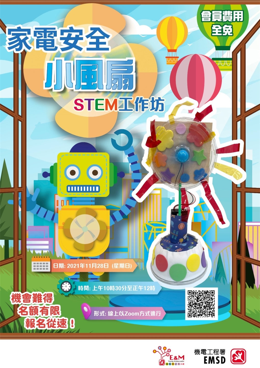 機電青少年大使STEM工作坊又開始報名!我相信各位EMYA小小工程師家裡一定有一部電風扇! 但原來選購一部小小的家居電風扇也有好多東西要留意~ 你們有沒有留意到在電風扇身上會有牌子、型號、電壓、頻率等等的資料? 電風扇是使用3腳插頭? 你們又知不知道使用電風扇要注意的地方? 如果大家想知道更多關於家電安全的資料以及想親手製作一部擁有個人特色的電風扇, 就千萬不要錯過我們的STEM 工作坊! 我們還會為參加者提供材料包,希望會員可以足不出戶就參加到精彩的活動。機會難得,快點叫朋友一起參加吧!!活動完結之後,大家還可以為自己的作品拍照,然後以電郵方式寄給我們 (電郵地址:emya@emsd.gov.hk) 。你們精美的作品還有機會被選中放上EMYA Facebook專頁,還可以收到精美小禮物一份!活動詳情: